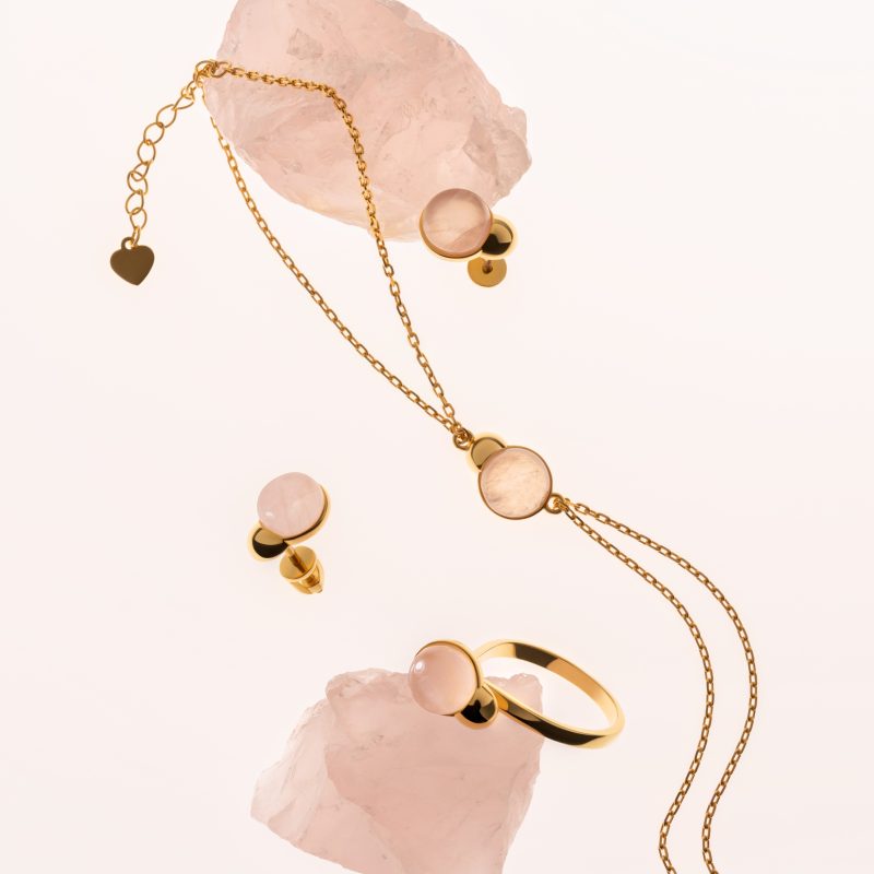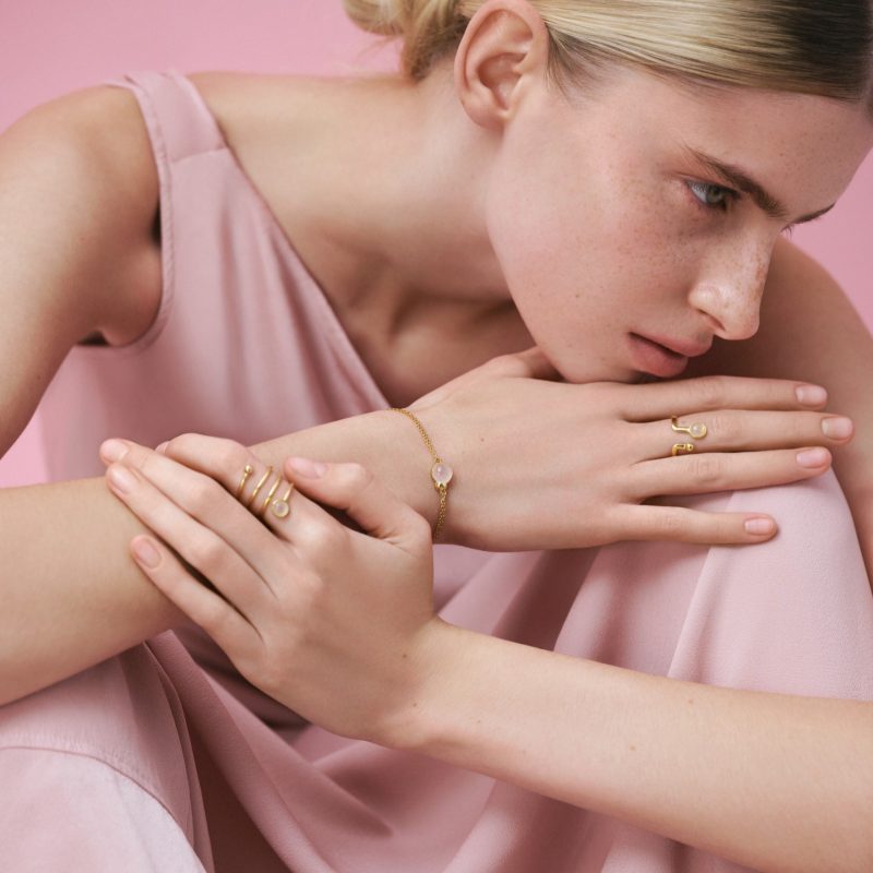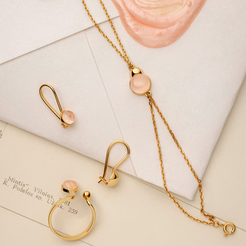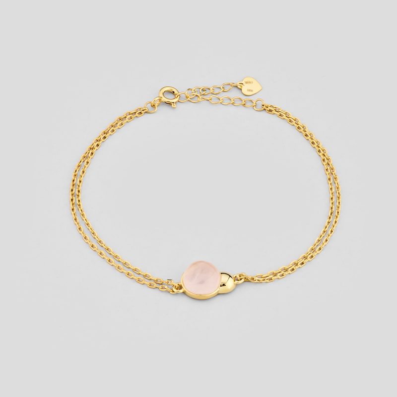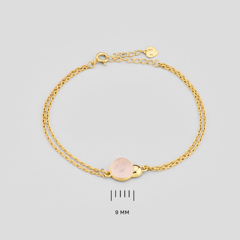 Браслет «Солодка прихильність» із срібла 925 проби з позолотою. Два кола — тепла позолота й ніжний рожевий кварц — з’єднані в центральному елементі браслета, немов символ гармонійного союзу. Подвійний ланцюжок додає відчуття легкості та водночас надійно фіксує прикрасу на зап’ясті. М’який блиск каменю відтіняє шкіру, а регульована застібка дозволяє підлаштувати довжину. Ця модель входить до колекції «Шлях Афродіти», що поєднує міфологічну символіку й сучасний дизайн.