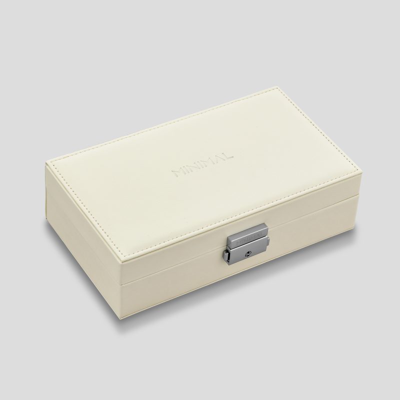 Бʼюті бокс «Daybreak» від Minimal — це порядок, що починається з першого променя. Світла еко-шкіра, оксамитова внутрішня оббивка й металеве замикання створюють відчуття надійності та спокою. Усередині — дзеркало й продумані відділення для каблучок, сережок, браслетів і кулонів. Розмір 21×12×6 см робить його ідеальним для дому та подорожей.