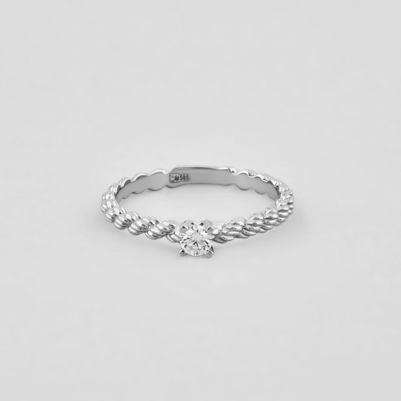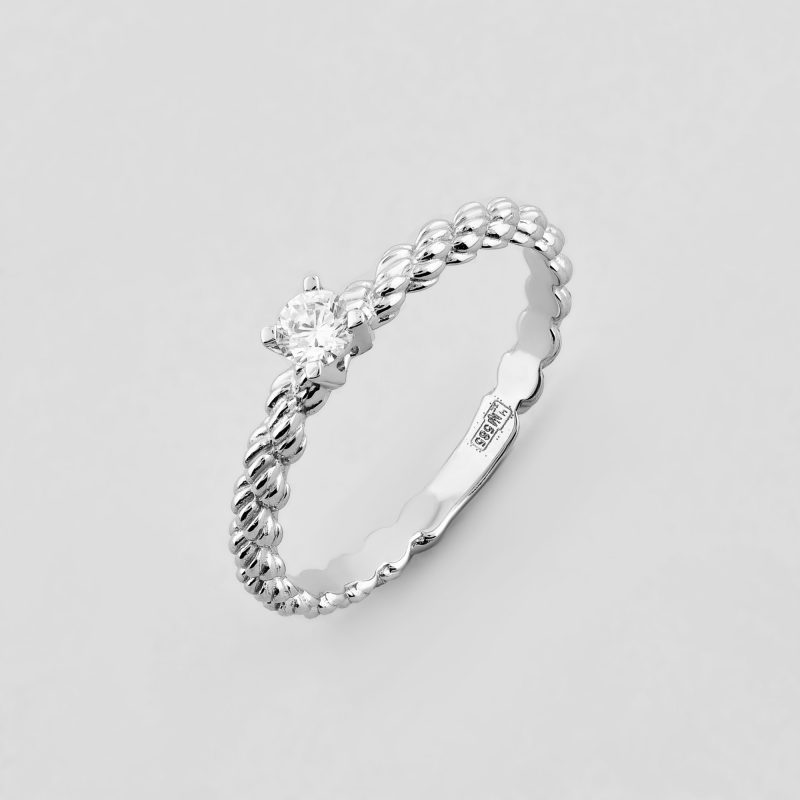 Каблучка Маленькі таємниці із білого золота 585 проби — графічна прикраса з тонкою, витончено переплетеною формою. Її силует нагадує нитку, що огортає палець м’якими лініями, ніби зберігаючи найособистіше. У центрі — прозорий фіаніт, мов тиха іскра серед делікатного сплетіння.