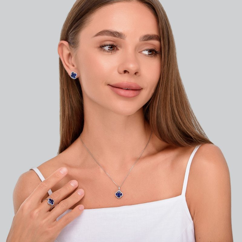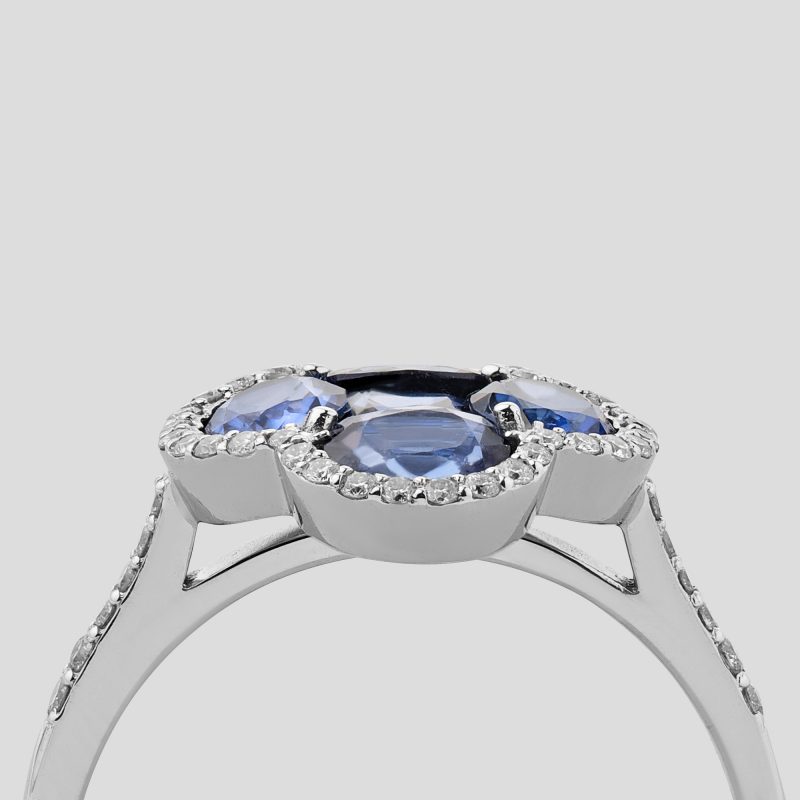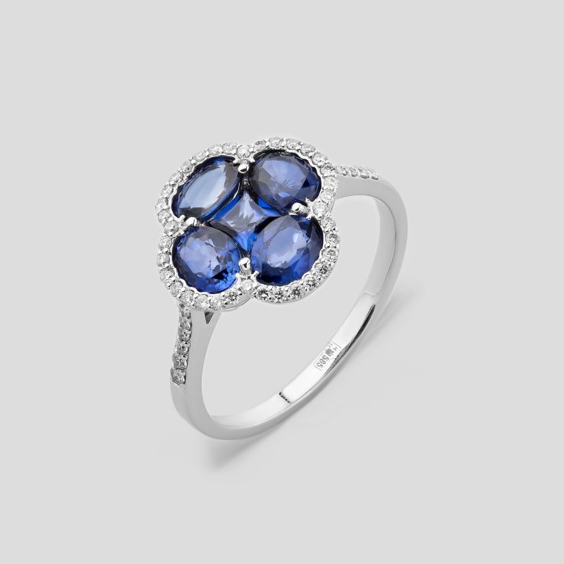 Розкішна каблучка з білого золота 585 проби прикрашена чотирма великими синіми сапфірами овального огранювання, які розташовані у формі квіткового візерунка. Доповнені розсипом білих діамантів по контуру та вздовж обідка каблучки, сапфіри створюють елегантний та витончений образ. Діаманти, що іскряться, підкреслюють глибину і насиченість синього відтінку каменів, додаючи прикрасі вишуканий блиск. Така каблучка стане ідеальним акцентом для вечірнього вбрання та символом витонченого смаку.