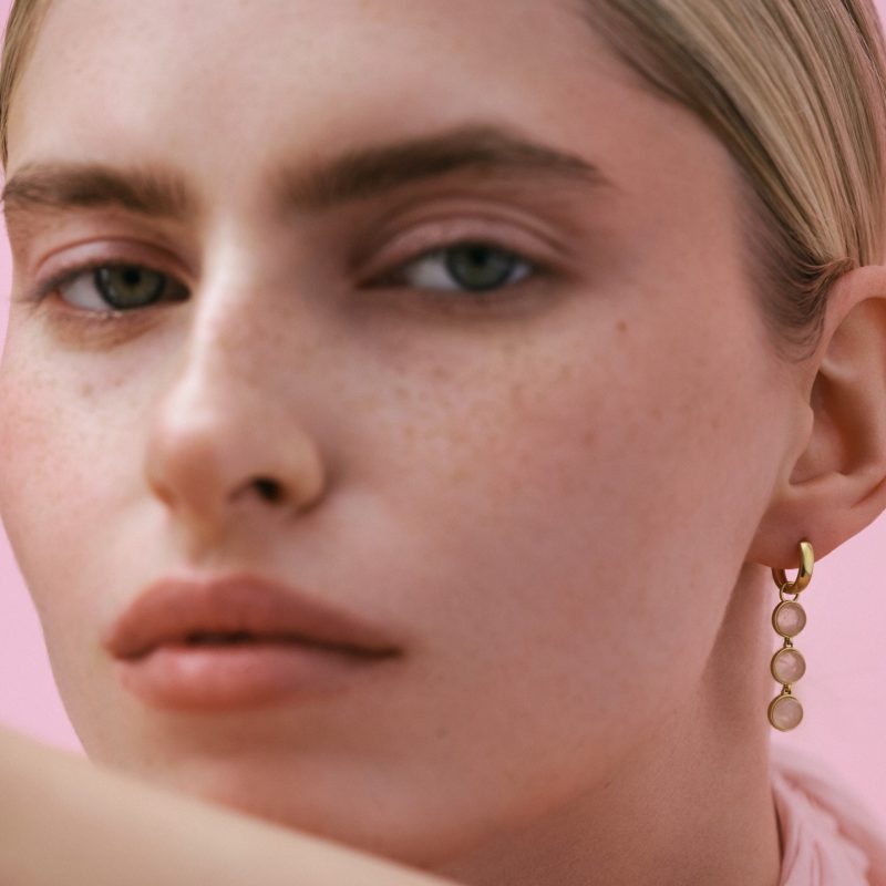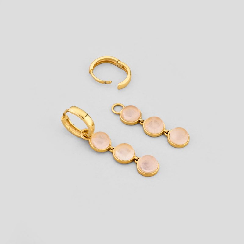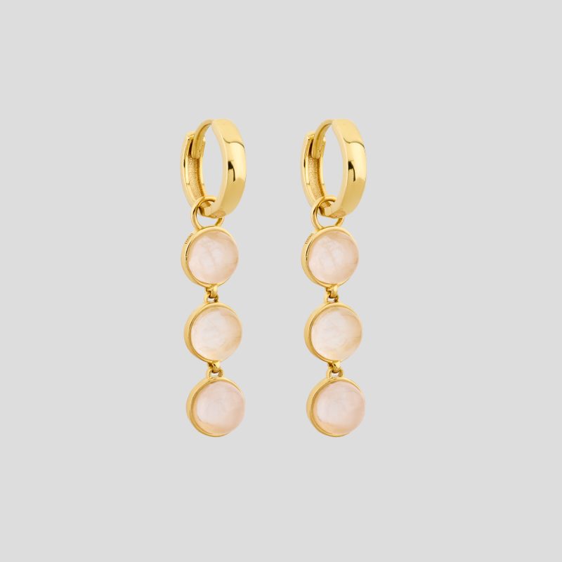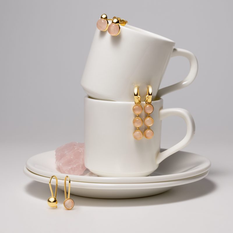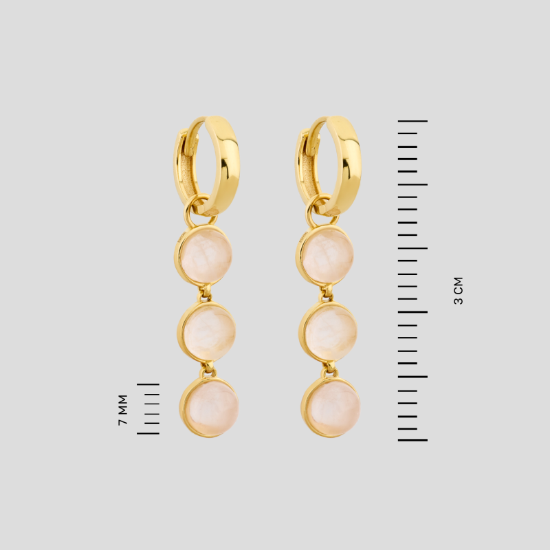 Сережки «Ранкова ніжність» із срібла 925 проби з позолотою. Три камені з рожевого кварцу вибудувані у вертикальну композицію, яка нагадує ніжний ритм світанку. Камені з’єднані рухомими ланками, завдяки чому сережки красиво коливаються й підсвічують обличчя у русі. Лаконічний каст у теплій позолоті підкреслює природну текстуру каменю. Ця модель є частиною колекції «Шлях Афродіти», що поєднує символіку жіночності з сучасним мінімалізмом.