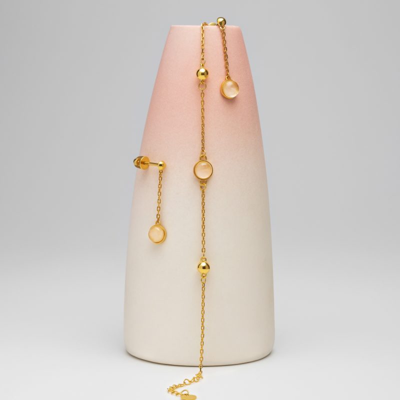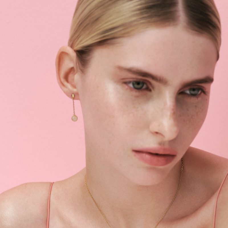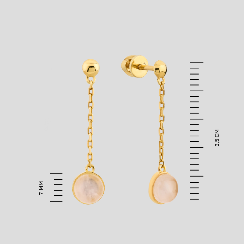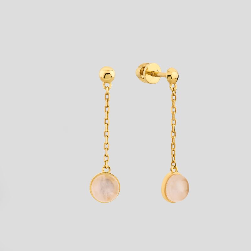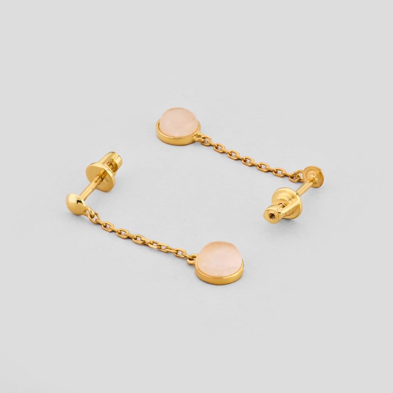 Сережки «Рожевий сон» із срібла 925 проби з позолотою. Дві лаконічні деталі з’єднані витонченим ланцюжком: у верхній частині сяє гладка золота кулька, а нижче — рожевий кварц у мінімалістичному касті. Такий контраст створює легкий рух і додає образу делікатної динаміки. Завдяки невеликій довжині сережки залишаються комфортними у щоденному носінні, але водночас стають виразним акцентом. Модель належить до колекції «Шлях Афродіти», що поєднує символіку кохання з сучасним дизайном.